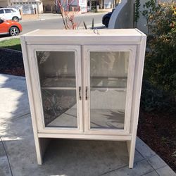 Farm House Style Accent Cabinet Featuring A Distressed Light Finish And Two Glass Doors For Storage Or Display $35Riverside County, CA
