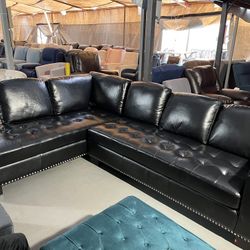 Bonded Leather Black Sectional With Ottoman Nailhead Trim Accent Pillows included Firm Price $980 FINANCING AVAILABLE $980Moreno Valley, CA