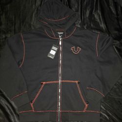 True Religion Super T Buddha Embroidered Zip Up Hoodie, Black W/ Red Stitching, Size Large$0Bloomington, CA