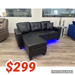 74"W Black PVC Reversible Sectional Sofa Chaise with LED Light,USB Port,Nailhead Trim,Throw Pillows,Tufted Cushion$299San Bernardino, CA