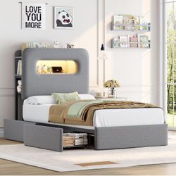 Twin LED Bed Frame with Storage Headboard and Charging Station, Boys Bed Frame with 2 Drawers and USB Ports, Velvet Upholstered Platform Bed Fra$140Ontario, CA