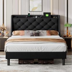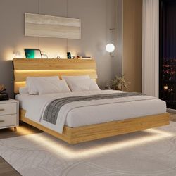Floating Bed Frame Queen with Led Lights and Charging Station, Wood Full Size Bed Frame with Storage Headboard, Heavy Duty Metal Slats, No Box Spring $120Rancho Cucamonga, CA