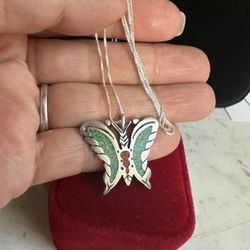 Vintage 925 Sterling Silver Native Am. Turquoise & Coral Chip Inlay Butterfly 🦋 Necklace , 20 In. 925 Chain, Hallmarked In Photos $35Victorville, CA