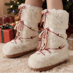 Women'S faux fur Boot | Furry Fluffy Short Snow Boot Lace-Up Mid-Calf Boots Warm Comfortable Outdoor Flat Shoes, Winter Fluffy Boots, Holiday Vacay Vi$35Buena Park, CA