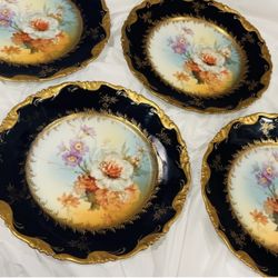 Fine Art Vintage Antique Original SET 4 Plate BAVARIA German Flower Germany Floral Cobalt Blue Gold Gilt /Gilded / Encrusted Display Collectible ALICE$222San Diego, CA