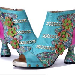 Soffia Catherine Floral Leather Heels Size 7 EU 38 - Boho Peep Toe Applique Boots$100Chula Vista, CA