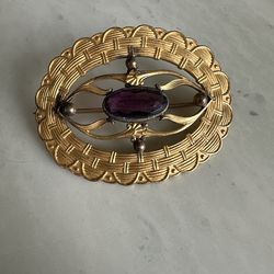 Vintage gold tone oval brooch w/ a central purple stone & ornate design$80Chula Vista, CA