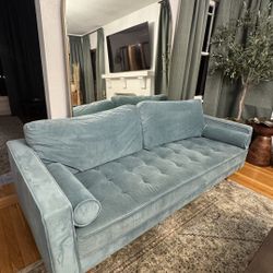 Midcentury modern velvet blue couch with two pillows $450El Cajon, CA