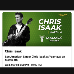 Chris Isaak Yaamava Casino Two Tickets$160City Of Industry, CA