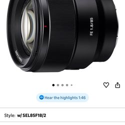 Sony SEL85F18 85mm F/1.8-22 Medium-Telephoto Fixed Prime Camera E Mount Lens, Black$450City Of Industry, CA
