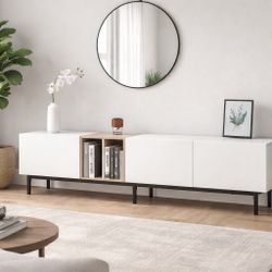 77” Mid-Century Modern White w/ Natural IWood Accent TV / Media Stand w/ Storage Cabinets [NEW / NEVER USED] ** ^Assembly Required^ $160City Of Industry, CA