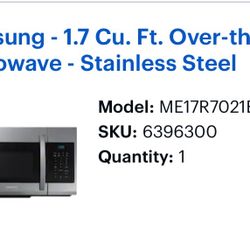 Samsung 1.7 Cu Over The Range Microwave- Stainless Steel $200Pico Rivera, CA