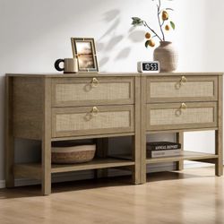 2 of set 23.6" Boho Bedside Table with USB Charging Station, 2 Drawers & Woven Rattan Shelf - Compact Oak Nightstand for Small Spaces$100El Monte, CA