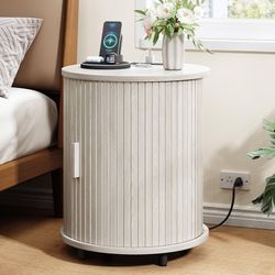 Round End Table with Charging Station, Mid Century Bedside Table with Sliding Door & 2 Tier Storage, Modern Nightstand for Living Room, Home, Natural $50Ontario, CA