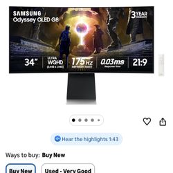 Samsung 34” Odyssey OLED WQHD Curved Monitor $600Torrance, CA
