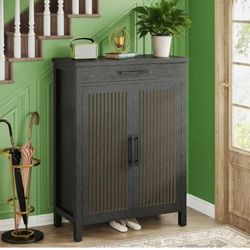 New assembled Farmhouse Louvered Door Shoe Cabinet, Sturdy Multifunctional Storage Organizer with Drawer for Entryway & Living Room(Black)