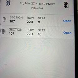 2 PADRES/TIGERS TICKETS FRIDAY, 3/27/26, SEC 107, ROW 22D$224San Diego, CA
