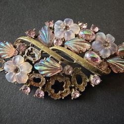 1930’s vintage Juliana (Delizza & Elster) pink and aurora borealis rhinestone flower and shell brooch. $20San Marcos, CA