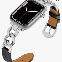 Leather Band Compatible with Apple Watch Band Women 38mm 40mm 41mm 42mm 44mm 45mm 49mm(Ultra), Dressy Leather Strap with Cool Chain for iWatch Bands S$10Santee, CA