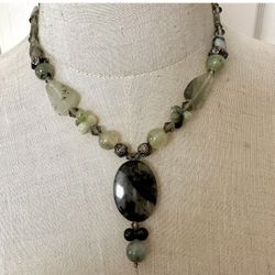 moss agate prehnite sterling silver Swarovski crystals Leaf carved beads beaded pendant necklace$75Carlsbad, CA
