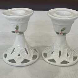 Pair of white porcelain candle holders with applied roses and openwork base.$35Anaheim, CA