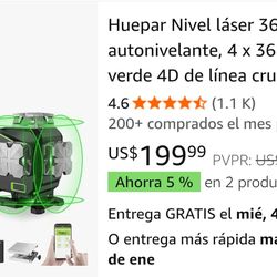 Huepar 360° Self-Leveling Laser Level, 4 x 360° 4D Green Cross Line Laser with LCD Display, Bluetooth Outdoor Pulse Mode Laser Tool for Construction, $180Costa Mesa, CA
