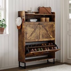 New Shoe Cabinet with 2 Flip Drawers, 45" Freestanding Narrow Wood Shoe Storage Cabinet with Metal Legs and Hooks, Slim Shoe Rack Organizer for Entryw$80La Mirada, CA