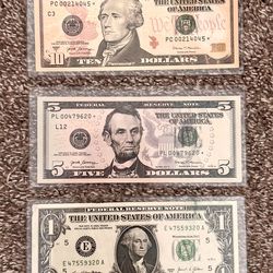 $10 & $5 Star note & $1 with ink smear$75Ontario, CA
