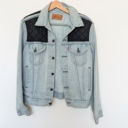 Levi Strauss Vintage Trucker Jacket Distressed Color lock Light Blue Denim And Black Leather $65Garden Grove, CA
