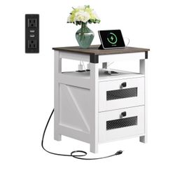 Nightstand with Charging Station, Farmhouse End Table, Bed Side Table with 2 Storage Drawers and Open Shelf, Wood Rustic Nightstands for Bedroom, Whit$50El Monte, CA
