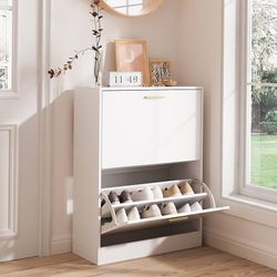 1766a Shoe Cabinet, Free Standing Tipping Bucket Shoe Rack Organizer with 2 Flip Drawers, Modern Entryway Shoe Storage with Top Display, Narrow Slim $60Bloomington, CA