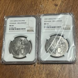 1999 GIBRALTAR 5pd TITANIUM MILLENNIUM NGC MS66 (First titanium coin ever made). Firm$105Castro Valley, CA
