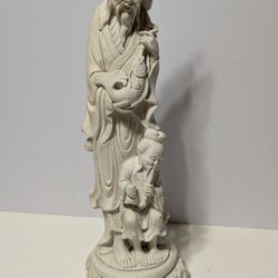 16.5" Asian Style Elder & Child Statue – Resin Faux Ivory Finish – Fish & Flute Motif