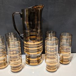 Mid Century Smokey Brown Pitcher with 6 Gold Banded Highball Glasses