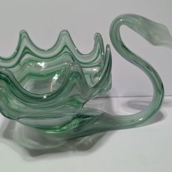Vintage Handblown Green Art Glass Swan Bowl with Wavy Rim 8x13 Decorative Piece