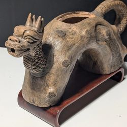 Handcrafted 14x8" Ceramic Dragon Teapot (Lid Missing) with Wood Stand - Tribal Art Decor