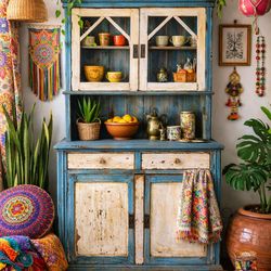 1890s Antique primitive one-piece stepback cupboard / pantry cabinet. Blue and white chippy paint.$625Garden Grove, CA