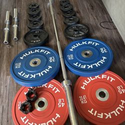 Bumper And Metal YORK Weights With 7 Ft 45 Lb Bar, Dumbbell Handles And Collar Locks $300West Covina, CA