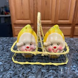 Vintage Anthropomorphic Lemons Friends Clowning Around Playing Games pair of salt and pepper shakers in a yellow wire basket. Size approximately 3 in$20Artesia, CA