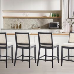 26.5" Rattan Bar Stools Set of 4 Modern Linen Fabric Upholstered Counter Height Bar Stools, Kitchen Island Barstools with Rattan Back, Black Finish Wo$299City Of Industry, CA