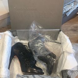 Alexander McQueen Black Floral Laser-Cut Peep Toe Stiletto Ankle Boots. $200Los Angeles, CA