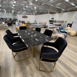 Black genuine marble top table with 6 black velvet chairs with gold metal frame$1,599Chino Hills, CA