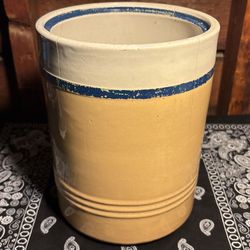 Vintage FarmHouse Medium Sized Antique Tan & Blue White Stripes Made In The USA Crock Jar $65Ripon, CA