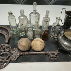 Antiques collection: baseballs, Bottles, Trophy, Camera.