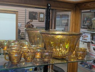 Vintage 13Pc Marigold Carnival Glass Punch Bowl Set Grape Pattern Display$60Stockton, CA