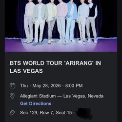 BTS Concert Tickets Las Vegas May 28, 2026$599Rancho Santa Margarita, CA