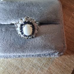 Vintage Sterling Silver Opal surrounded by Opal Halo Cluster with Blue Sapphire Accents, size 7