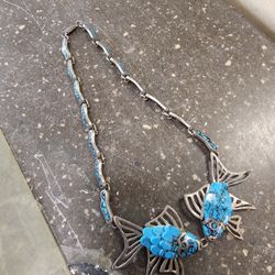 Vintage coin silver & turquoise necklace with fish