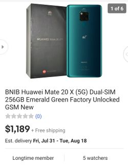 Huawei Mate 20 X (5G) Dual-SIM 256GB + 8GB RAM (GSM Only, No CDMA) Factory Unlocked Android Smartphone (Emerald Green)$900Turlock, CA