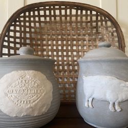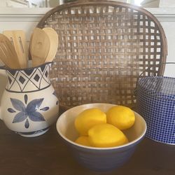 Decorative pitcher, vintage tin can, blue ceramic bowl$25Turlock, CA